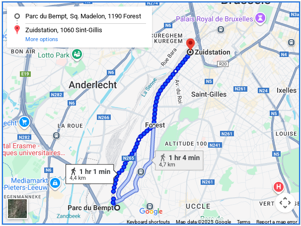 To give a sense of scale, here is a 4.7km trip in Brussels, that goes directly from the periphery to the main train station (maps data: Google):